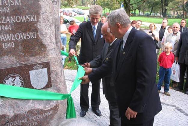 "Głaz Pamięci" w chwili odsłonięcia. Wstęgę trzymają: prezydent Miasta Poznania Ryszard Grobelny i prezes ZG PTTK Lech Drożdżyński, a przecina prezes Oddziału Poznańskiego PTTK Marian Chudy
